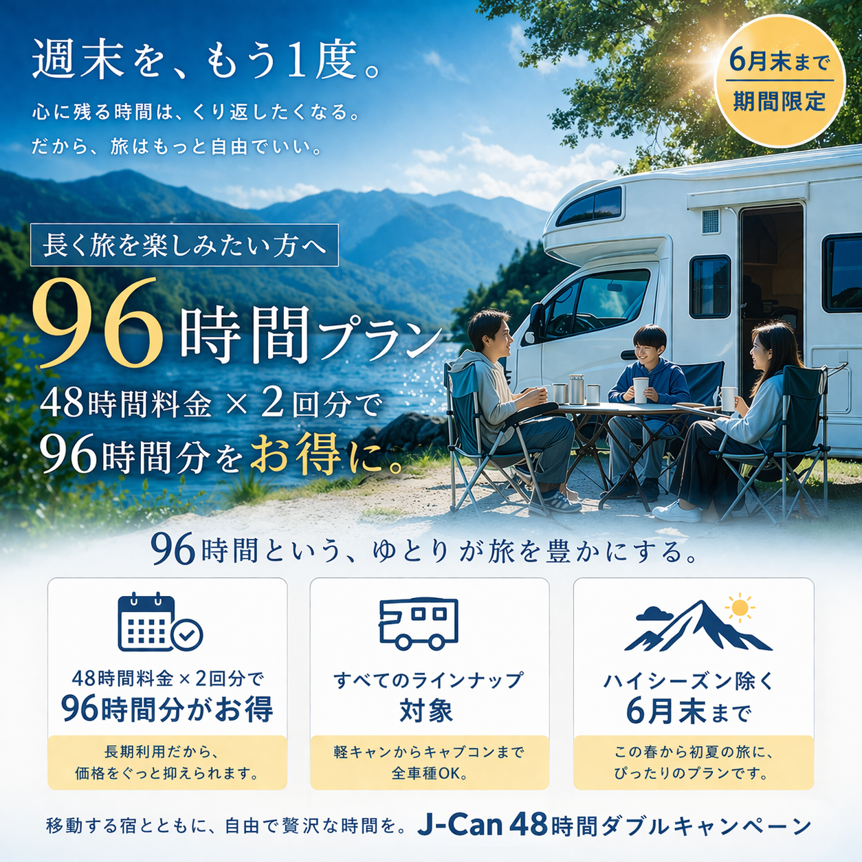 長く旅を楽しみたい方へ。J-Canの48時間ダブルキャンペーンは、 96時間分の旅を、ぐっと身近にする期間限定プランです。